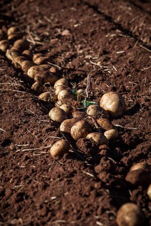 Freshly harvested potatoes on soil mound dirt clad skins and roots raw and organic