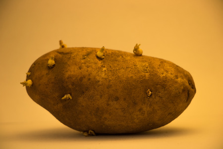 Many ugly plain potatoes with sprouts in different shapes on yellow background. With copy space. High quality photo