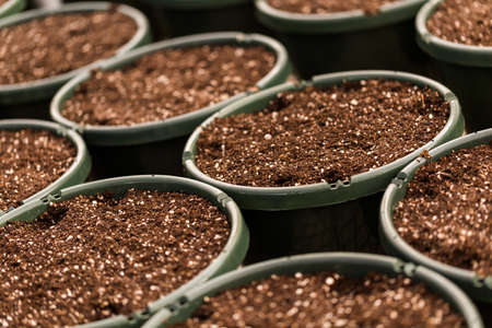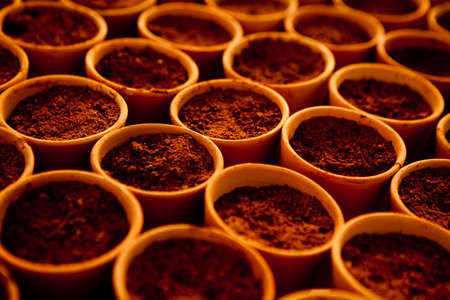Small planting pots with topsoil ready for planting season.