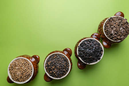 Watermelon seeds of different varieties in clay pots on a green background, top view.