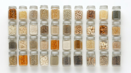 Explore a captivating array of seeds and grains showcasing diverse shapes and textures on a light background, ideal for nature and agricultural themes.