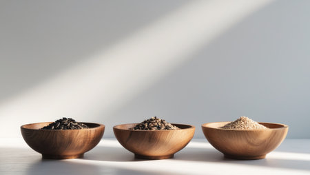 AI Generated. Three Wooden Bowls Filled with Different Types of Seeds