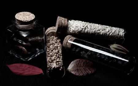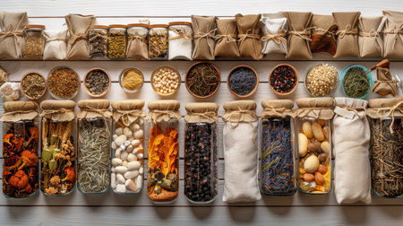 Dried Herbs, Flowers, and Ingredients in Jars and Sacks, Natural Medicine and Wellness Concept