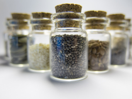 simple food ingredients concept, seed jars with sesame poppy pupmkin chia and flax seeds as important nutrient sources for nutrition shot on white background