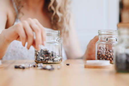 A woman's hand near an assortment with dry tea