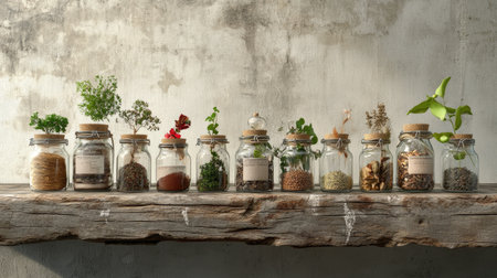 A row of glass jars filled with assorted spices displayed on a rustic wooden shelf. Ideal for culinary themes, showcasing diverse flavors and natural ingredients.