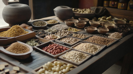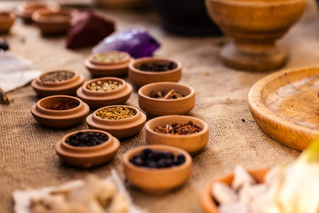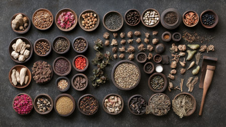 This captivating image showcases a vibrant display of diverse spices and herbs arranged in rustic bowls, highlighting their rich colors and textures.