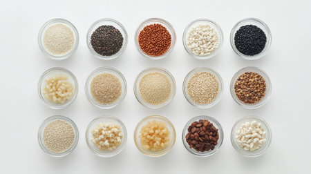 A stunning arrangement of diverse grains and seeds displayed in clear glass bowls on a white background, perfect for culinary and health-themed projects.