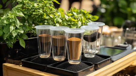 Water filtration experiment set up with gravel, sand, charcoal, and transparent containers