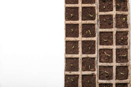 Peat pots with soil and green seedling on white background