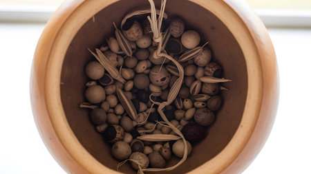 Dried pods and seeds. Overhead view of wooden bowl with earthy tones