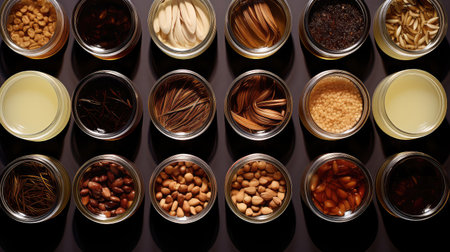 A variety of spices and herbs are neatly displayed in jars, offering a top-down view. the assortment highlights vibrant colors and textures, enhancing culinary inspiration.