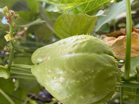fresh green chayote vegetable growing on vine with natural leaves background in daylight