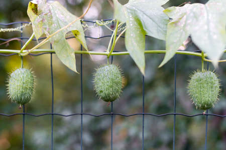 one green prickly wild cucumber and white yellow flowers on a branch of a wild plant in nature