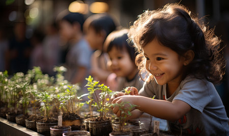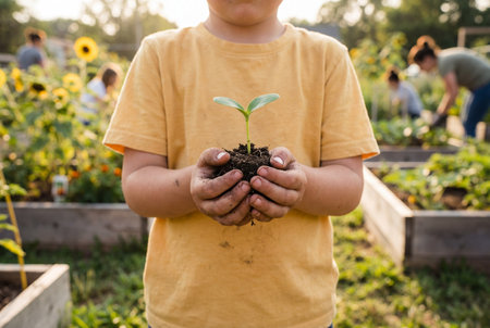 A young child's hands gently cradle a small green plant, symbolizing hope and new beginnings in a vibrant garden, illuminated by natural light.