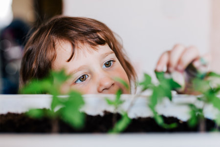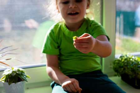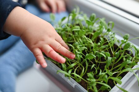 Little child cares for plants. Spring concept, nature and care.
