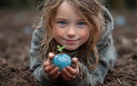 Child with curly hair is holding a blue seed ball in soil, emphasizing the significance of planting and nurturing nature for environmental sustainability