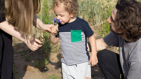 Mom, dad and son on walk in countryside in summer in field of wheat. Family and care. Nature and way of life. . High quality photo