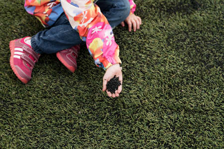 Close up of a 4-year-old girl sitting on a green grass with dirt in her hand.