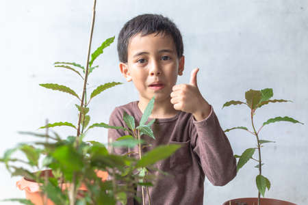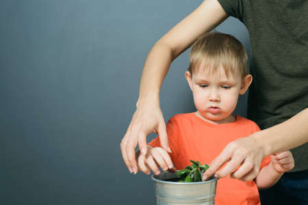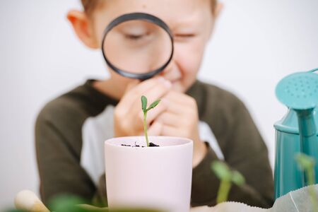 Little boy planting seedlings at home. An independent child is busy with a hobby with potted plants. Lifetime concept