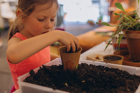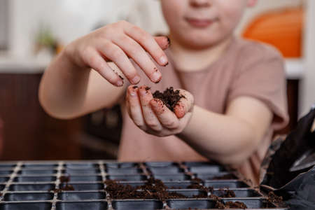 Girl planting seeds for seedlings in small recyclable peat pots, seedling container.Children learn to grow