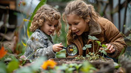 Two little children, boy and girl, looking through a magnifying glass at a seedling