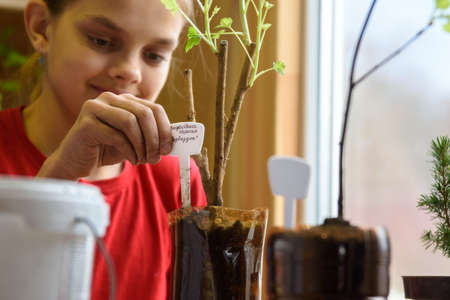 A girl inserts indicative plates for seedlings into plastic bottles with seedlings of berry bushes