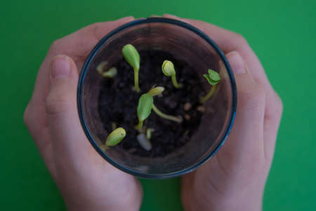 Green seedlings in a glass pot in the hands of a child on a green background