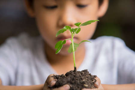 Selective focus of hands Asian child boy holding a little green plant with soil. Growing tree. Spring season. Save environment. Earth day