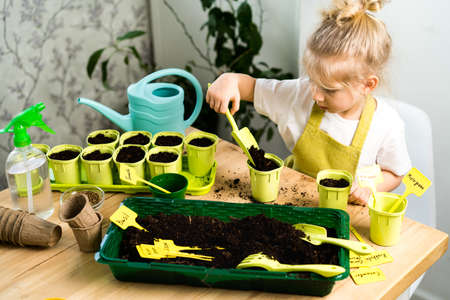 A small blonde girl in an apron is engaged in planting seeds for seedlings, smiling, looking at the camera, the concept of children's gardening.