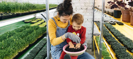 Woman with baby boy working on the indoor farm, planting microgreens. Choosing seeds and watering sprouts of fresh herbs on the shelf. Child learning about nature. agriculture and business with mother
