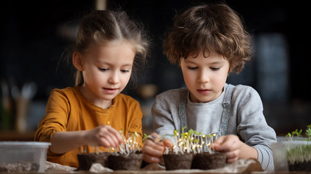Close-up of children's hands planting flowers and vegetables in small biodegradable seedling pots. Children helping with spring chores. Kids exploring nature.