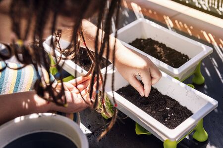 close up of a girl putting seeds in the dirt of the flower pots at the balcony, hobbies at home, sustainable and ecological lifestyle concept