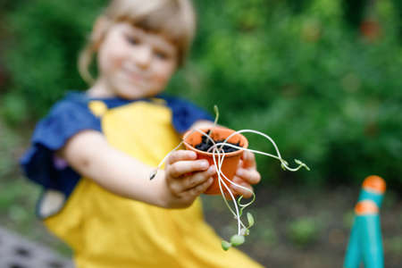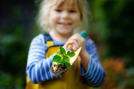 Adorable little toddler girl holding garden shovel with green plants seedling in hands. Cute child learn gardening, planting and cultivating vegetables in domestic garden. Ecology, organic food.