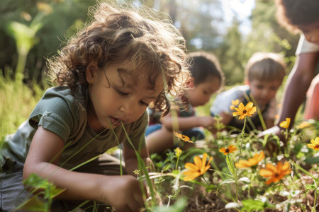 Concentrated children participating in a hands-on environmental education session, planting in a vibrant forest.