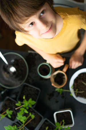 Little boy planting seedlings at home. An independent child is busy with a hobby, replanting plants, sprinkling flowers. Lifetime concept