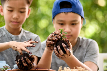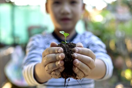The seedling are growing on the soil in the boys hand, Family activity on weekend to learning Beyond Classroom. ecology concept.reafforestation for save the earth