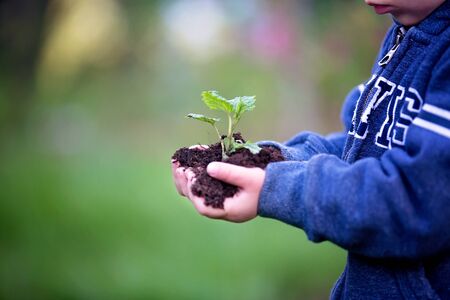 The child holds the plant and soil in his hands. selective focus. kid.