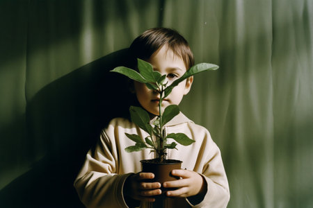 An AI generated illustration of A young boy holds a small potted plant in his hands