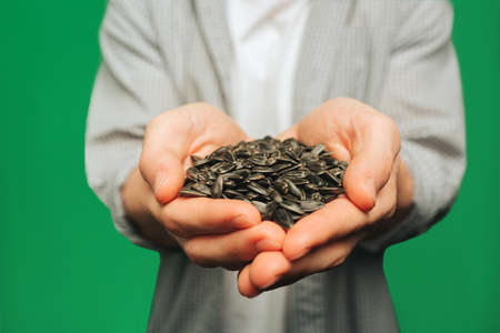 Close up young man holds sunflower seeds in hands, isolated on green background