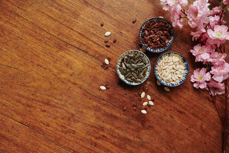 Flatlay with small bowls with watermelon, sunflower and pumpkin seeds prepared for spring festival celebration