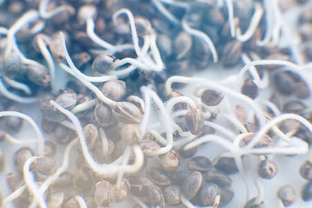 Germinated cannabis seed. close-up macro. Sale of cannabis seeds. Hovering Hemp. Macro photo cultivation seeds. Details Root on a white background. Many sprouting cannabis seeds. Marijuana seeds.