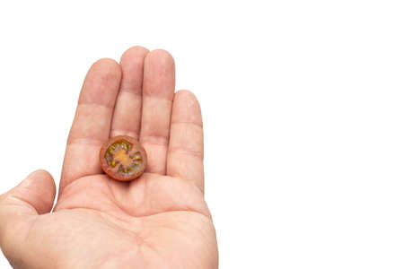 An open hand holding one half of a cherry tomato, the mini kumato variety. Isolated on white background.