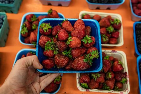Mans hand holding a square cardboard container filled with beautiful red strawberries. Ripe and delicious fresh fruit. Blurry background.