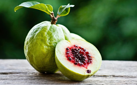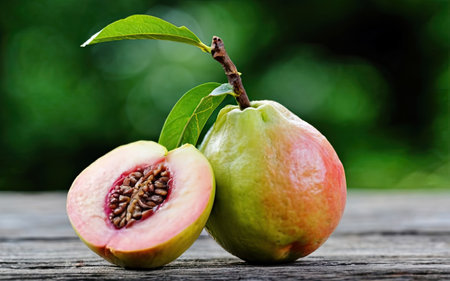 Fresh guava fruit on wooden table with nature bokeh background
