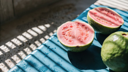 Guava fruits broken in half. Tropical fruits. Guavas in halves. Source of vitamin C. Fruit indicated for the immune system. antioxidant. Detox diet.