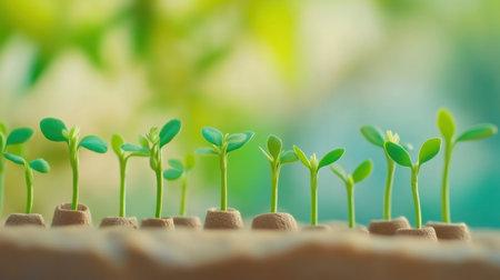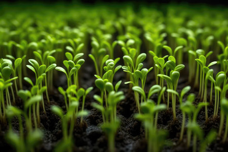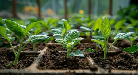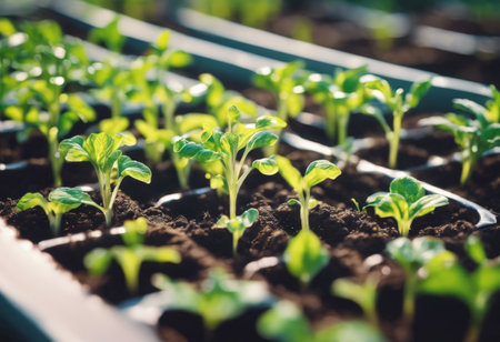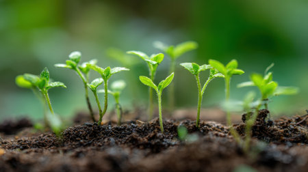 The image showcases vibrant young seedlings growing in rich organic soil, illuminated by soft natural light, symbolizing growth, renewal, and sustainable plant cultivation practices.