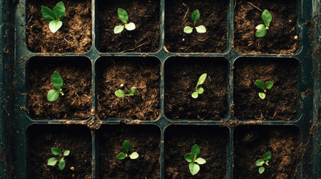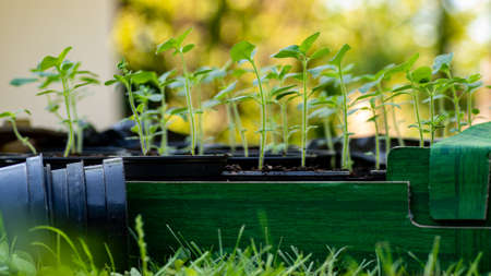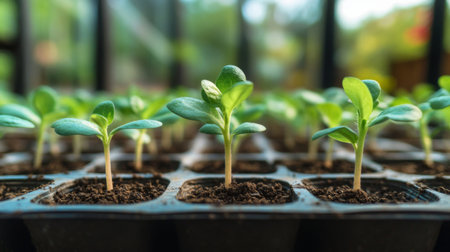 the small delicate seedlings nestled in a tray filled with black soil, against a vibrant spring background, promising growth for plants and vegetables