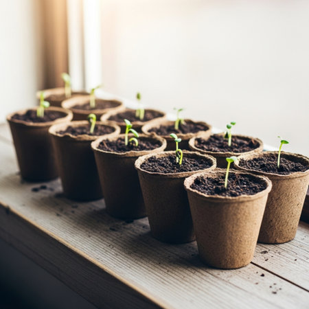 Close-up of seedlings in biodegradable bags on a balcony. High quality photo