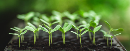growing green seedling or small tree on soil. Working in the organic vegetable garden, taking care of young seedlings and transplanting young plants into the garden soil.Growing green seedlings in a greenhouse. Preparing the garden for spring. Image with selected soft focus